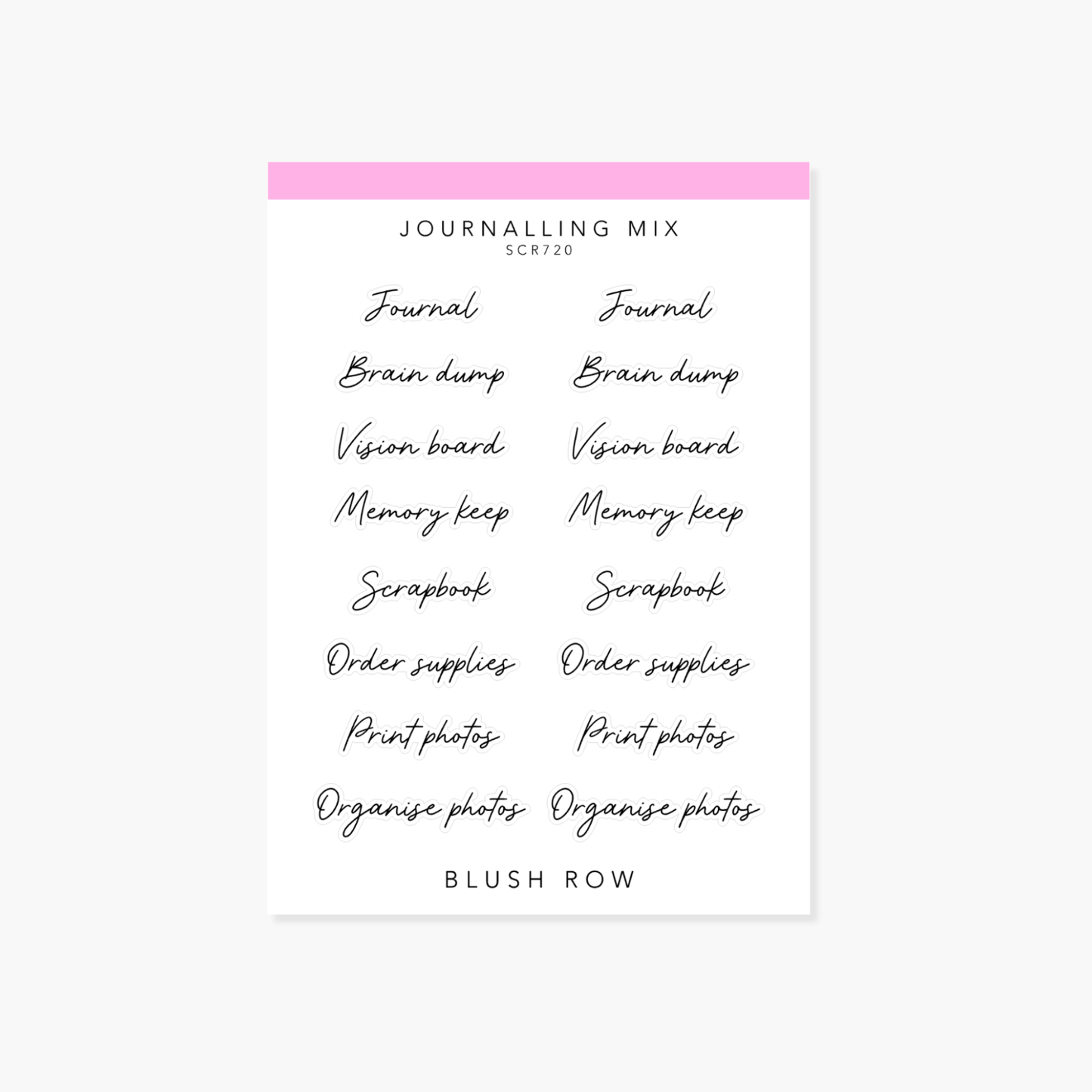 These Journalling Mix scripted planner stickers feature words like journal, scrapbooking, print photos, and organise photos. Perfect for marking time for creative projects, photo layouts, and journalling sessions in your planners and notebooks.